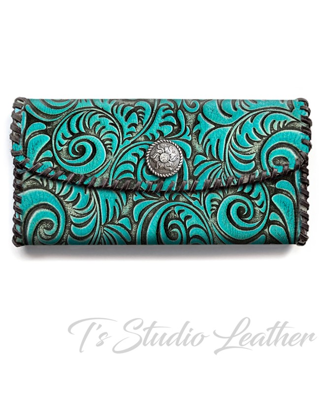 Western Style Turquoise and Dark Brown Leather Phone Case with matching Apple Watch band - Genuine Cowhide Leather Watch Strap and Case