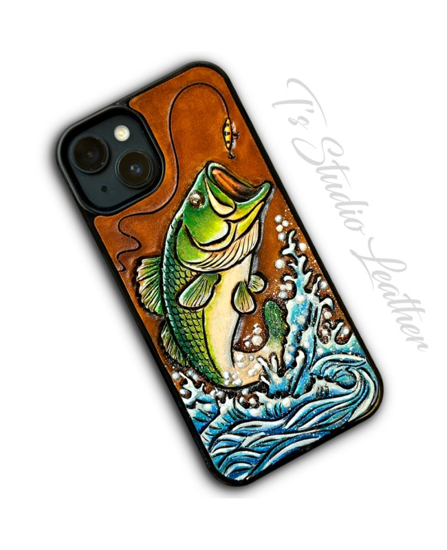 Largemouth Bass Fish Hand Tooled and Hand Painted Genuine Leather Phone Case