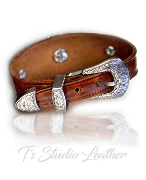 This beautiful leather cuff bracelet is made with genuine natural leather, that is dyed a rich whiskey brown (can be dyed any color you like). It is accented with an antique silver cross concho and finished with a gorgeous western style buckle clasp.