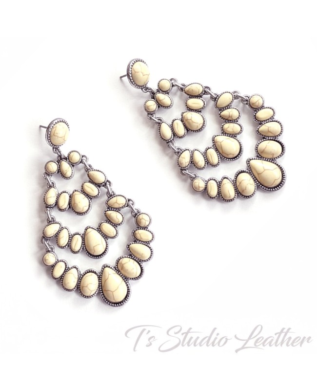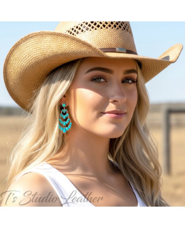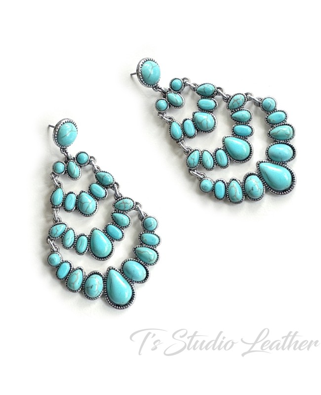 Chandelier Western Style Turquoise Colored Stone Earrings in Antique Silver Settings, post style back
