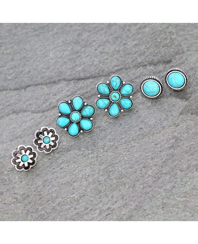 Turquoise Silver Set of 3 Concho Stud Earrings - Western Style Jewelry