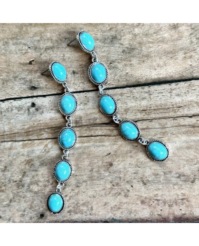 Long Dangling Western Style Turquoise Stone Earrings in Antique Silver Settings, with post style back