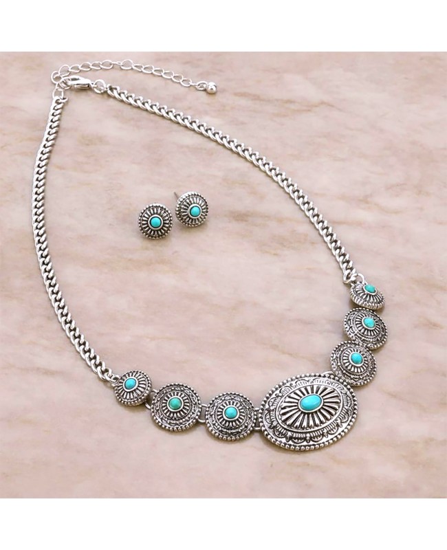 Turquoise and Silver Concho Style Necklace and Earrings Set