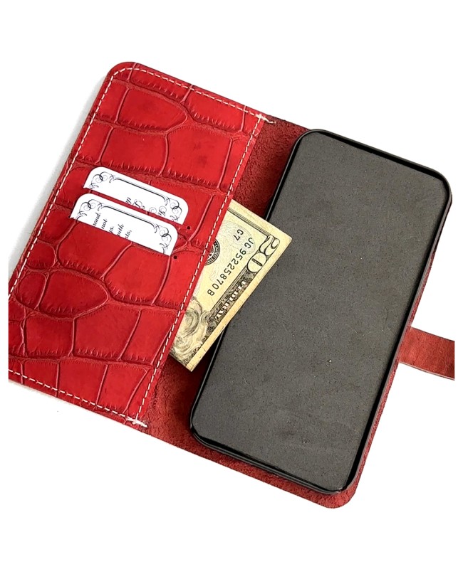 Red Alligator Crocodile Leather Wallet Style Phone Case by Ts Studio Leather - Embossed Genuine Cowhide Leather Folio Phone Case