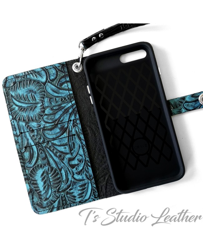 Turquoise and Black Embossed Leather Wallet Style Phone Case by Ts Studio Leather - Western Style Tooled Leather Floral Folio Phone Case