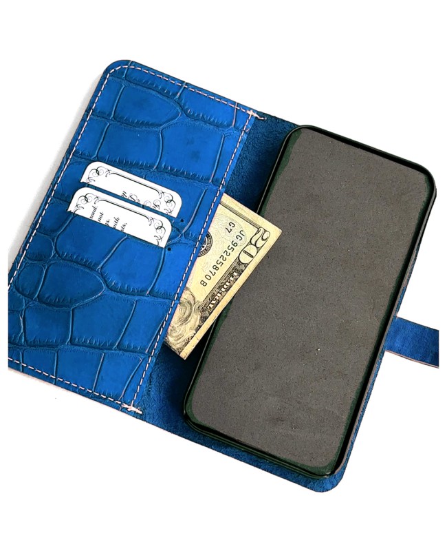 Blue Alligator Crocodile Leather Wallet Style Phone Case by Ts Studio Leather - Embossed Genuine Cowhide Leather Folio Phone Case