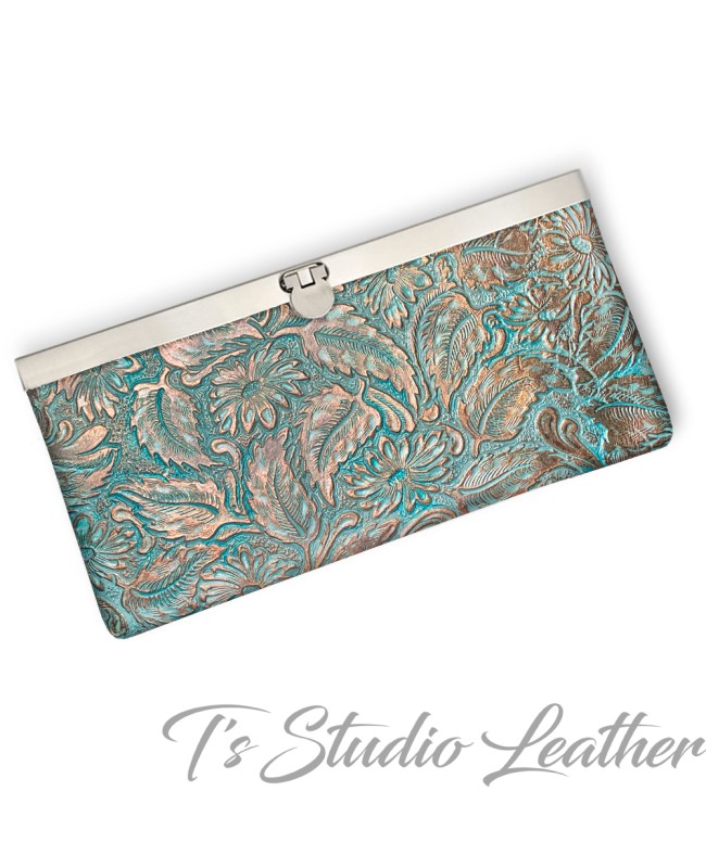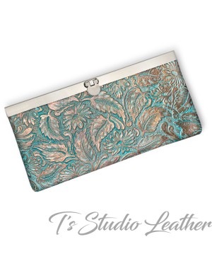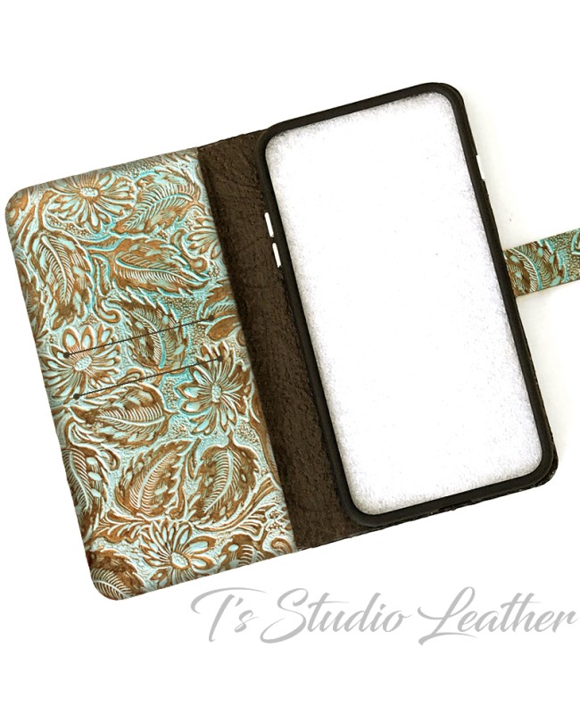 Copper and Turquoise Embossed Leather Wallet Style Phone Case by Ts Studio Leather - Western Style Tooled Leather Floral Folio Phone Case
