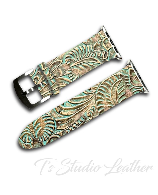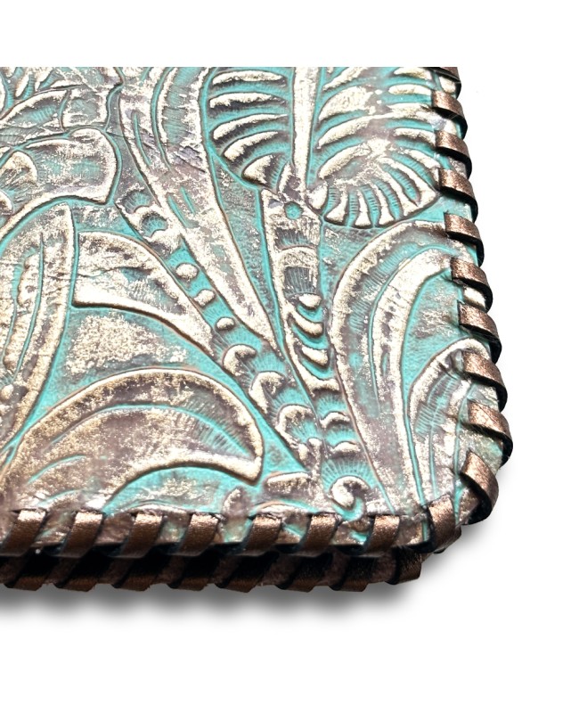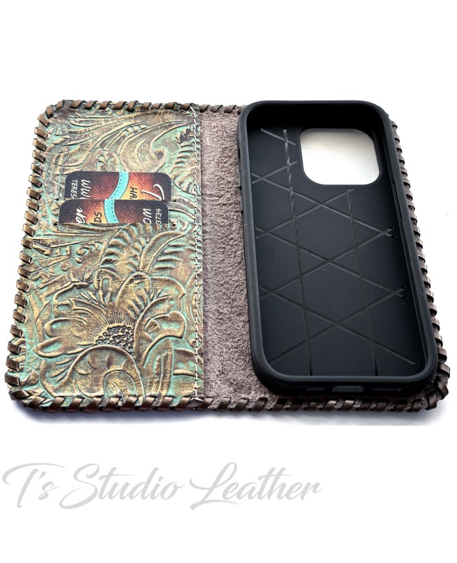 Whipstitched Edge Copper and Turquoise Embossed Leather Wallet Style Phone Case by Ts Studio Leather - Western Style Tooled Leather Floral Folio Phone Case