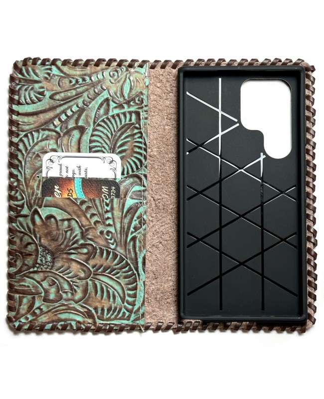 Whipstitched Edge Turquoise and Brown Floral Embossed Leather Wallet Style Phone Case by Ts Studio Leather - Western Style Tooled Leather Floral Folio Phone Case